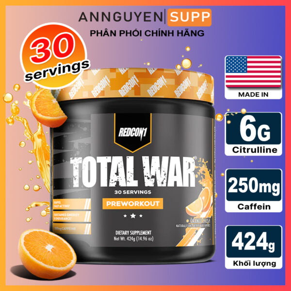 Bạn đang tìm kiếm loại thực phẩm bổ sung trước khi tập để giúp bạn có buổi tập hiệu quả hơn ? Total war là sản phẩm bán chạy số 1 của REDCON1! TOTAL WAR là dạng bột trước khi tập luyện, kết hợp mạnh mẽ các yếu tố sức bền, bơm máu mạnh hơn, cung cấp năng lượng và tập trung. Với 320mg caffeine, 3,2g beta alanine và 6g citrulline malate là cốt lõi của công thức, mỗi muỗng TOTAL WAR đều chứa đầy đủ các thành phần được nghiên cứu lâm sàng ở mức hiệu quả để bạn có thể tập luyện ở cấp độ ưu tú, mọi lúc.